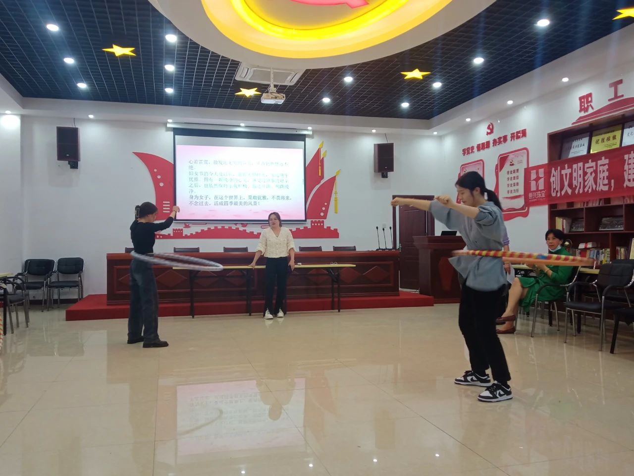 ? ? ?接下來是生動活沷的呼拉圈比賽,大家無論是有點基礎還是剛剛接觸,都全力以赴地投入到比賽中,歡聲笑語充滿整個會議室,熱火朝天的場面彰顯了女性的活力與自信!