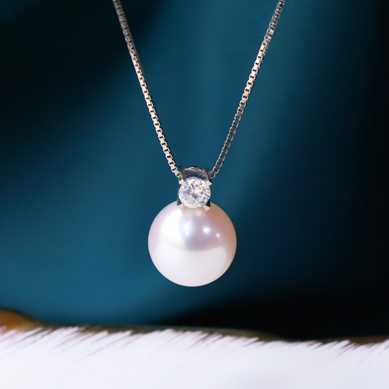 天然海水單顆18K金鉆石正圓強(qiáng)光日本akoya珍珠吊墜項(xiàng)鏈