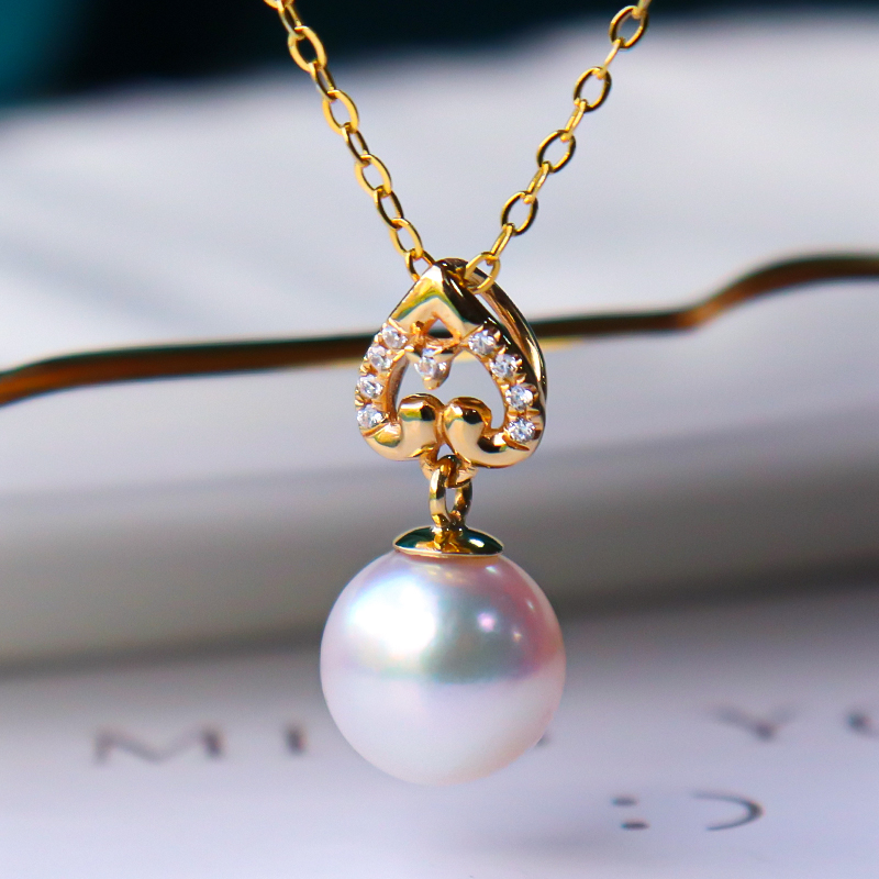 日本akoya珍珠吊墜項(xiàng)鏈18K金單天然海水愛心款正圓項(xiàng)墜
